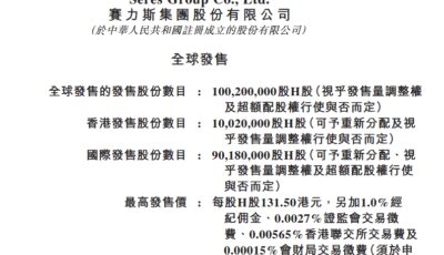 10月27日,赛力斯在港交所发布公告称,公司拟全球发售1.002亿股H股,发售价将不高于每股H股131.50港元,预期股...