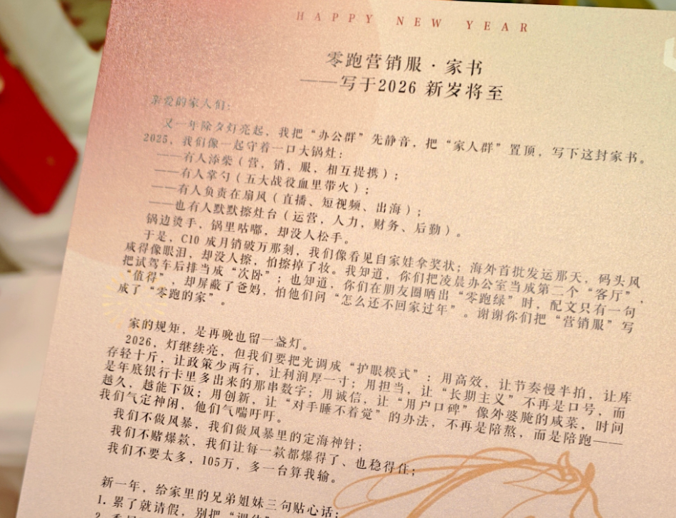 整封信以“零跑不赶路,零跑在造路”作为收束,不追逐短期风口,而是致力于打造自身的技术道路、运营体系和品牌护城河。