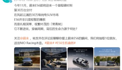 10月23日消息,蔚来官方于近日宣布,旗下的ES6车型将迎里程碑时刻,第30万台今年11月交付。 图片来源:微博截图 据...